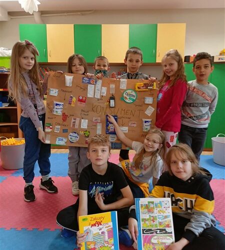 Na początku kwietnia w świetlicy szkolnej zgodnie z tematem kompleksowym „ABC dobrego konsumenta” nauczyciele przeprowadzili zajęcia mające na celu zapoznanie dzieci z różnymi aspektami współczesnego handlu. Podczas zajęć uczniowie dowiedzieli się między innymi: jak rozsądnie robić zakupy, co dzieci mogą kupować same, a czego nie, czemu służą reklamy i jak z nich korzystać, aby im nie ulegać. Uświadomiliśmy dzieciom, dlaczego należy sprawdzać datę ważności produktu i co oznaczają różne symbole na opakowaniach. W ramach zajęć zapoznaliśmy uczniów, co można zrobić, gdy kupiony towar ma wadę, co to jest gwarancja, dlaczego zawsze trzeba zachować paragon i jakie instytucje pomagają konsumentom. Uczestnicy zajęć zapoznali się z komiksem „Zakupy z Maxem”, wykonali plakaty związane z tematem tygodnia, reklamę ulubionego produktu oraz odgrywali scenki dramowe prezentujące dobre i złe zachowania kupujących. Na koniec uczniowie rozwiązywali quiz podsumowujący wiadomości z całego tygodnia. Zajęcia cieszyły się dużym zainteresowaniem, a zdobyta wiedza z pewnością zostanie wykorzystana przez dzieci podczas robienia zakupów z rodzicami.
