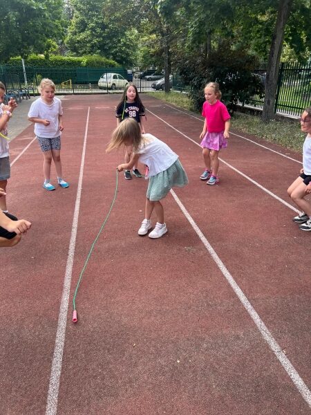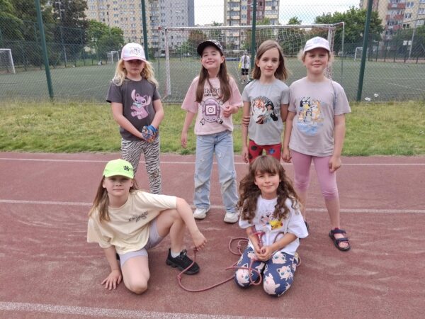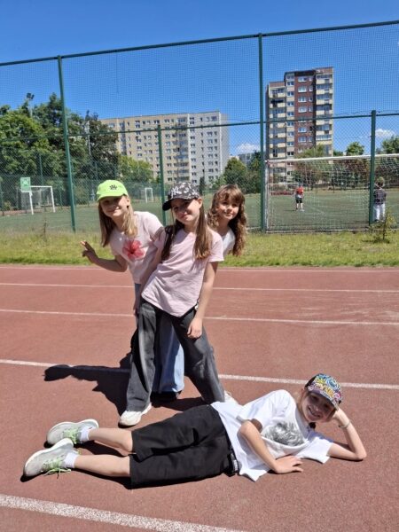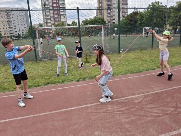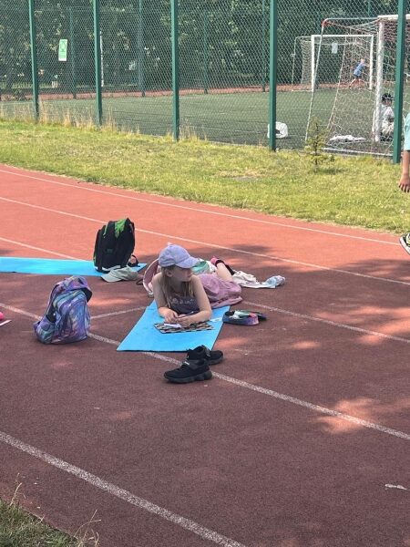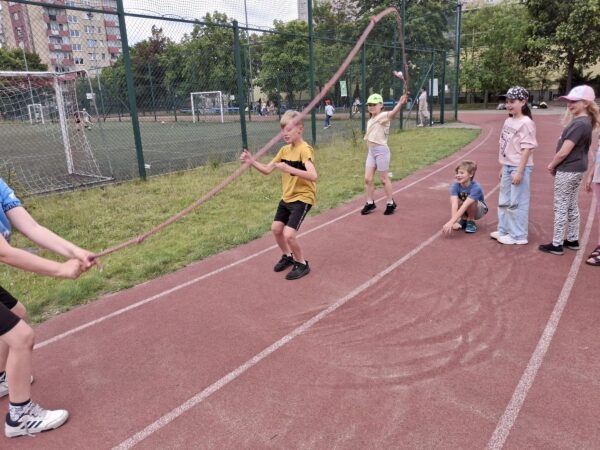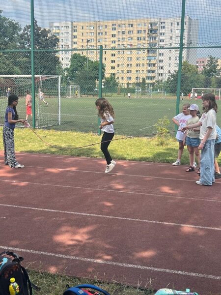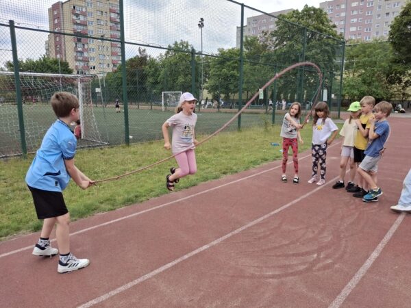 W oczekiwaniu na upragnione wakacje, dzieci uczęszczające do szkolnej świetlicy chętnie spędzały czas na świeżym powietrzu. Boisko i plac zabaw tętniły życiem – odbywały się emocjonujące rozgrywki piłkarskie, zabawy ze skakanką oraz chwile relaksu na matach. Wspólna aktywność na dworze była doskonałą okazją do ruchu, integracji i radości z nadchodzącego letniego odpoczynku.
