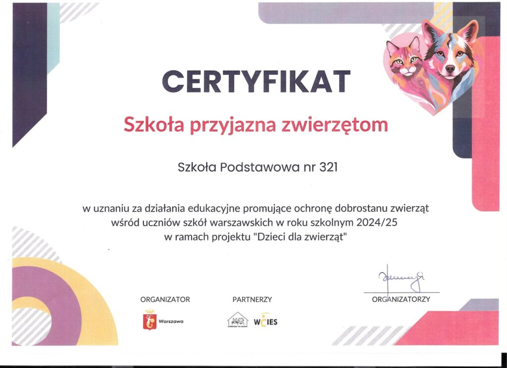 W roku szkolnym 2024/2025 dzieci z klasy 2c i 2d uczęszczające do świetlicy realizowały Stołeczny Projekt „Dzieci dla zwierząt”. Jego celem było uwrażliwienie uczniów na potrzeby zwierząt oraz kształtowanie postaw odpowiedzialności i empatii. Dzieci uczestniczyły w pogadankach jak należy opiekować się zwierzętami, przygotowywały plakaty i prace plastyczne, a także wzięły udział w zbiórce karmy i akcesoriów dla schroniska. Mamy nadzieję, że uczestnictwo w projekcie przyniosło wartościowe doświadczenia i nauczyło dzieci, jak ważne jest szacunek i troska o naszych mniejszych przyjaciół. Jesteśmy dumni z zaangażowania uczniów oraz z tego, że mogliśmy wspólnie przyczynić się do tak pięknej inicjatywy. Za udział w projekcie nasza świetlica otrzymała certyfikat.