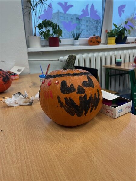 W klasie panowała radosna atmosfera. Na stołach leżały różne gadżety do ozdobienia naszych kolorowych dyń, a w powietrzu unosił się zapach farb i jesiennych dekoracji. Kiedy skończyliśmy, wszystkie dynie ustawiliśmy na parapecie. Wyglądały przepięknie – kolorowo i wesoło.
