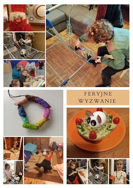Ferie to zdecydowanie czas odpoczynku, który może odbywać się na różny sposób. Część naszych uczniów podjęło codzienne wyzwanie polegające na wykonywaniu różnych czynności pozytywnie wpływających na motorykę dużą, mała oraz prawidłową koordynację. Zadania te miały na celu pokazanie jak ważne na prawidłowy rozwój ruchowy są codzienne czynności takie jak samodzielne przygotowanie posiłku, rozwieszenie prania, samodzielne ubieranie się, zabawy na placu zabaw czy też pomoc w pracach porządkowych.
