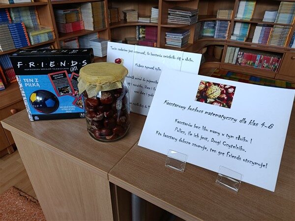 Zapraszamy, klasy 4-8, do wspólnej zabawy o tytuł Rachmistrza. Zadanie polega na oszacowaniu, ile kasztanów zmieściło się w słoiku. Można go brać do ręki i obracać, ale nie wolno otwierać i wysypywać zawartości. Pamiętaj, możesz typować tylko raz. Podaj swoją odpowiedź w bibliotece, jak najszybciej. Kto pierwszy napisze poprawnie, ile jest kasztanów – wygrywa! Zwycięzcę uhonorujemy…. grą Friends, inspirowaną serialem telewizyjnym Przyjaciele.