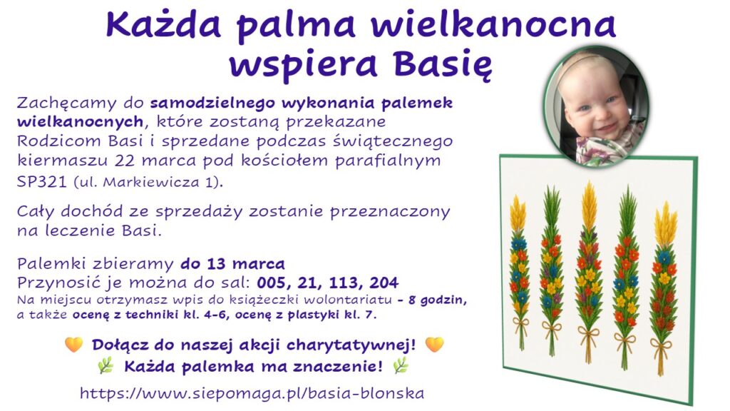 Zachęcamy uczniów, rodziców, nauczycieli, pracowników szkoły do samodzielnego przygotowania palemek wielkanocnych, które zostaną przekazane Rodzicom Basi i sprzedane podczas świątecznego kiermaszu 22 marca pod kościołem parafialnym SP321 (ul. Markiewicza 1).