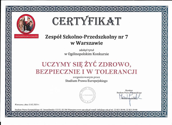 Miło nam poinformować, że nasza świetlica zdobyła kolejny certyfikat w Ogólnopolskim Konkursie „Uczymy się żyć zdrowo, bezpiecznie i w tolerancji” organizowanym przez Centrum Prawa Europejskiego. Konkurs trwał pięć miesięcy i składał się z 10 zadań. Każde wykonane zadanie musiało być udokumentowane wraz ze zdjęciami i sprawozdaniem przesłane do Komisji. Zadania były bardzo ciekawe. Dzieci w każdym zadaniu miały okazję wykazać się swoją wiedzą, a także umiejętnościami