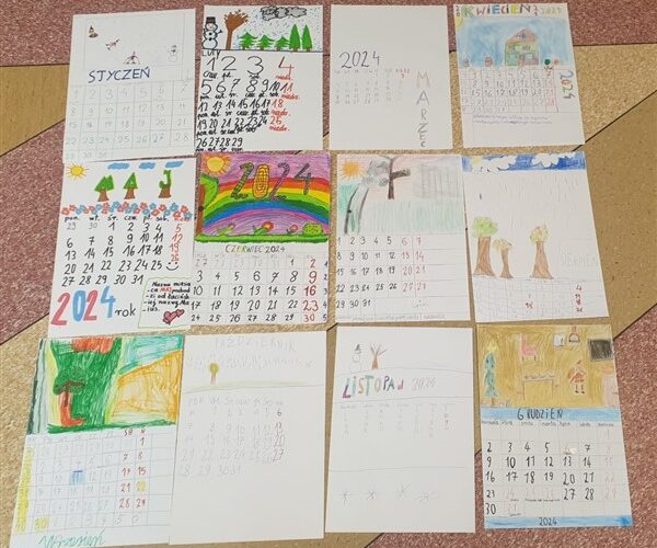 Nowy rok, to nowe wyzwania, nowe postanowienia, nowe plany i nadzieje oraz… nowy kalendarz. Najładniejszy jest taki, który wykonało się samodzielnie, bo można na nim umieścić to, co najbliższe sercu. Dlatego corocznym zwyczajem, w pierwszym tygodniu nowego roku, dzieci uczęszczające do szkolnej świetlicy wykonały karty kalendarza na rok 2024. Młodsi uczniowie, po omówieniu cech charakterystycznych dla pór roku oraz odpowiadających im miesięcy- tylko ilustrowali daną nazwę miesiąca, zaś starsi- wykonać musieli dodatkowo odpowiednie kalendarium. Dzieci pracowały z ogromnym przejęciem, a najładniejsze prace zostały nagrodzone.