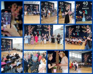 Uroczystość rozpoczęła się od prezentacji, podczas której przedstawione były różne urywki z życia szkoły na przestrzeni 40 lat. W tle rozbrzmiał utwór „Twarze”, który wszystkich wprowadził w nostalgiczny nastrój. Po wprowadzeniu Sztandaru Szkoły oraz odśpiewaniu hymnu, Pani Dyrektor Agnieszka Ostasz w swoim przemówieniu powitała zgromadzonych gości. Podziękowała wszystkim, którzy przyczynili się do rozwoju szkoły, tworząc wspólnie pozytywną, rodzinną atmosferę, sprzyjającą właściwemu wychowaniu, edukacji i kształtowaniu młodego pokolenia.