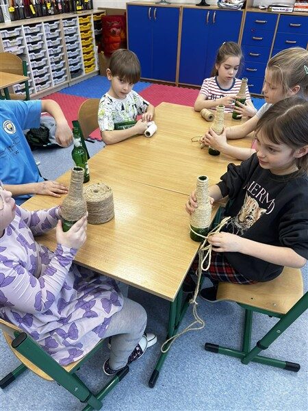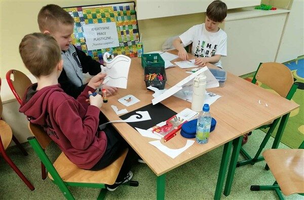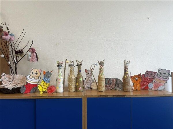 W części plastycznej uczniowie kolorowali obrazki przedstawiające koty oraz wykonywali papierowe koty, wykazując się dużą pomysłowością i starannością. Pojawiły się też koty z butelek. Powstały piękne i barwne prace, które ozdobiły naszą świetlicę.