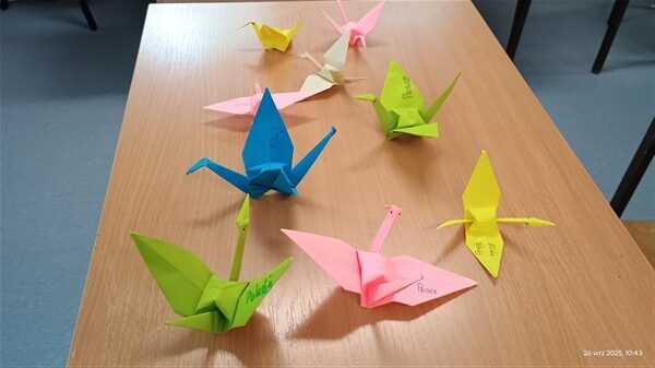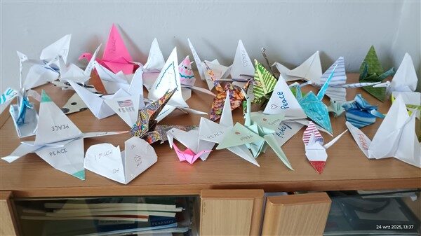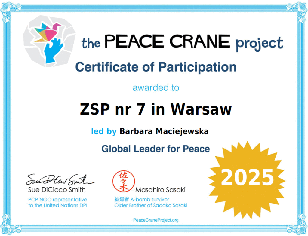 Uczniowie klasy 8a, 8b i 8e oraz 7d wraz z p. Barbarą Maciejewską biorą udział w programie Armed with the Arts – The Peace Crane Project mającym na celu rozwijanie u dzieci kreatywności. Projekt jest związany z obchodzeniem Światowego Dni Dnia Pokoju. About – Peace Crane Project