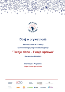 Nasza szkoła przystąpiła do programu edukacyjnego UODO „Twoje dane – Twoja sprawa”, którego celem jest upowszechnienie wiedzy o ochronie danych osobowych wśród uczniów, nauczycieli oraz rodziców. Program organizowany jest przez Prezesa Urzędu Ochrony Danych Osobowych, pod honorowym patronatem Ministra Edukacji i Nauki oraz Rzecznika Praw Dziecka. Program pozwala nam na poszerzenie wiedzy o tym, jak poprawnie przetwarzać dane osobowe oraz jak skutecznie przeciwdziałać naruszeniom ochrony danych. Uczniowie pozyskają wiedzę, która ułatwi im funkcjonowanie nie tylko w społeczności szkolnej, ale także w środowisku lokalnym, a w przyszłości i zawodowym.