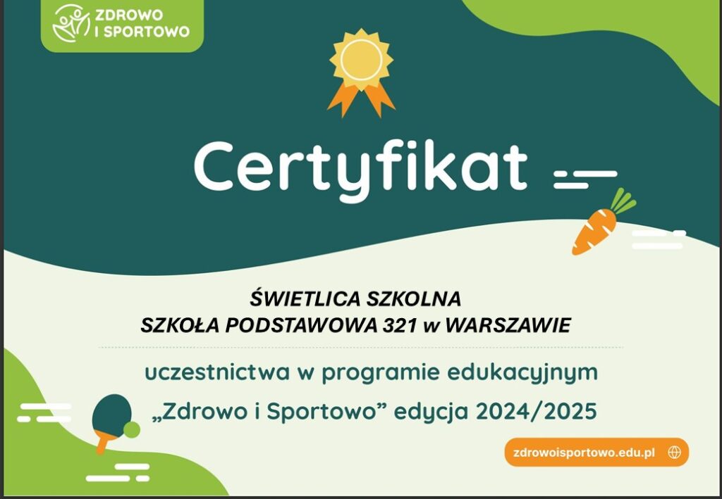 W roku szkolnym 2024/2025 nasza świetlica wzięła udział w ogólnopolskim programie edukacyjnym „Zdrowo i Sportowo”. Głównym celem programu było promowanie zdrowego stylu życia, aktywności fizycznej oraz kształtowanie właściwych nawyków żywieniowych wśród dzieci w wieku szkolnym. W ramach realizacji programu w świetlicy przeprowadzono szereg zajęć tematycznych, które łączyły edukację z ruchem i zabawą. W uznaniu za aktywny udział w programie nasza świetlica otrzymała certyfikat. Planujemy kontynuację działań prozdrowotnych w kolejnych latach.