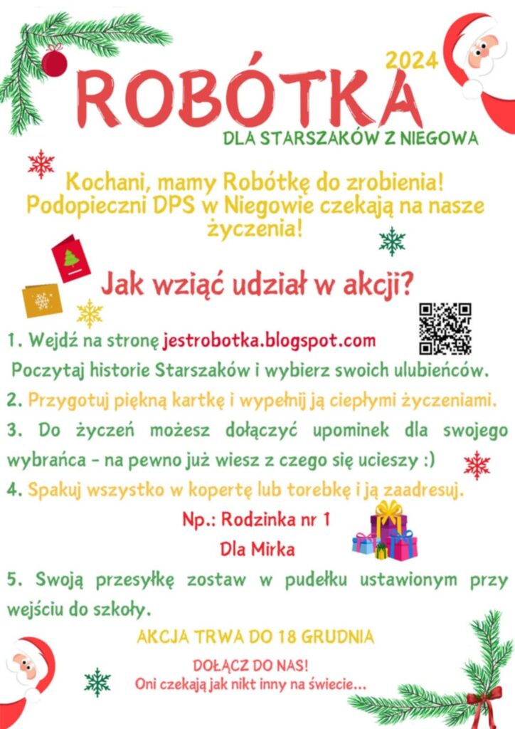 WOLONTARIAT: Uczniowie, którzy chcą uzyskać 5 punktów wolontariatu proszeni są o wgranie zdjęcia przygotowanej przez siebie kartki na Padlet Robótka 2024 – galeria inspiracji (uczniów, którzy chcą uzyskać punkty wolontariatu prosimy o przynoszenie robótkowych upominków do koordynatorek akcji: Katarzyny Dzwonowskiej – sala 113 lub Anny Chmiel – sala 17; na bieżąco będziemy wpisywać punkty do książeczki).