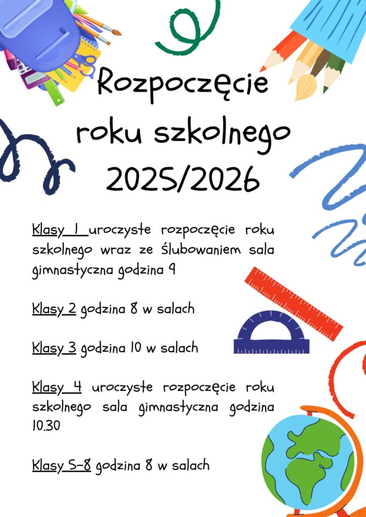 Uroczyste rozpoczęcie roku szkolnego 2025/2026 odbędzie się w sali gimnastycznej dla uczniów klas pierwszych i czwartych.