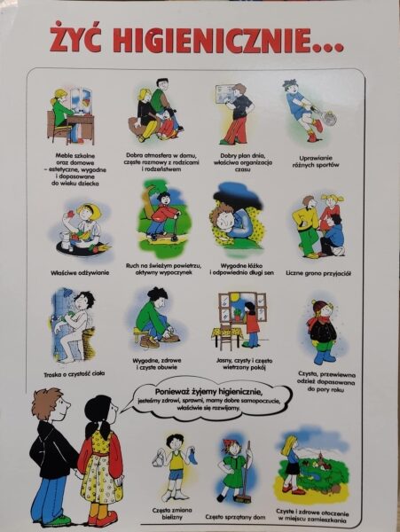 Podczas pogadanki pani pielęgniarka opowiedziała dzieciom o zasadach higieny osobistej, podkreślając, jak istotne jest regularne mycie rąk, dbanie o czystość ciała, zębów i paznokci. W przystępny i ciekawy sposób przedstawiła również zasady zdrowego odżywiania oraz znaczenie aktywności fizycznej dla prawidłowego rozwoju i odporności organizmu.