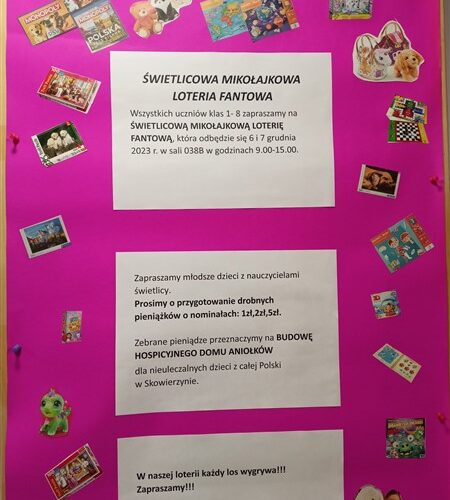 Z tej okazji 6 i 7 grudnia w świetlicy szkolnej dla uczniów naszej szkoły zorganizowaliśmy Mikołajkową Loterię Fantową. Pluszaki, planszówki, książki i inne gadżety cieszyły się dużym zainteresowaniem. Każdy los niósł wygraną i kosztował 1 zł, 2 zł i 5 zł. Dochód z loterii w całości zostanie przeznaczony na budowę Hospicyjnego Domu Aniołków Skowierzynie dla nieuleczalnie chorych dzieci z całej Polski. Tak duże zainteresowanie akcją charytatywną wskazuje, że nasza społeczność szkolna ma bardzo wrażliwe serca i chętnie niesie pomoc tym, którzy jej potrzebują. Serdecznie dziękujemy tym wszystkim, którzy wsparli naszą loterią kupując losy.