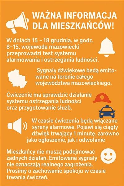 W dniach 15 – 18 grudnia, w godz. 8-15, wojewoda mazowiecki przeprowadzi test systemu alarmowania i ostrzegania ludności. Sygnały dźwiękowe będą emitowane na terenie całego województwa mazowieckiego. Ćwiczenie ma sprawdzić działanie systemu ostrzegania ludności oraz przygotowanie służb. Działania te odbędą się w ramach ćwiczenia „Syrena-25”, którego celem jest doskonalenie systemu zarządzania kryzysowego i ochrony ludności.