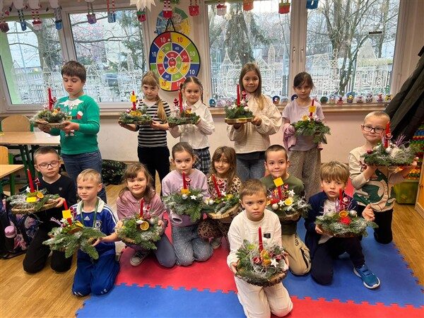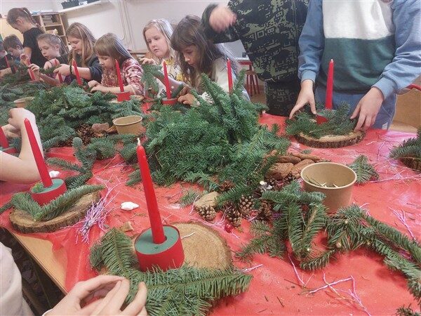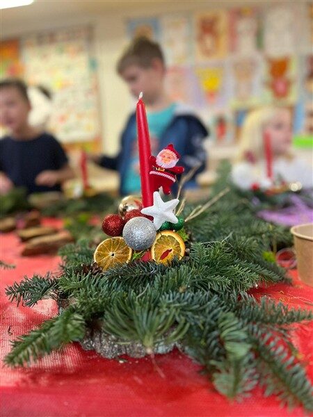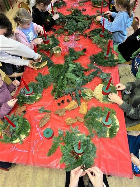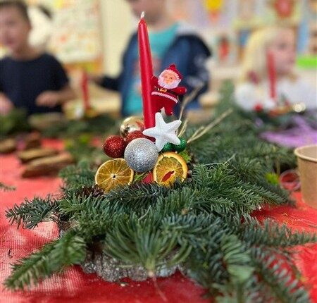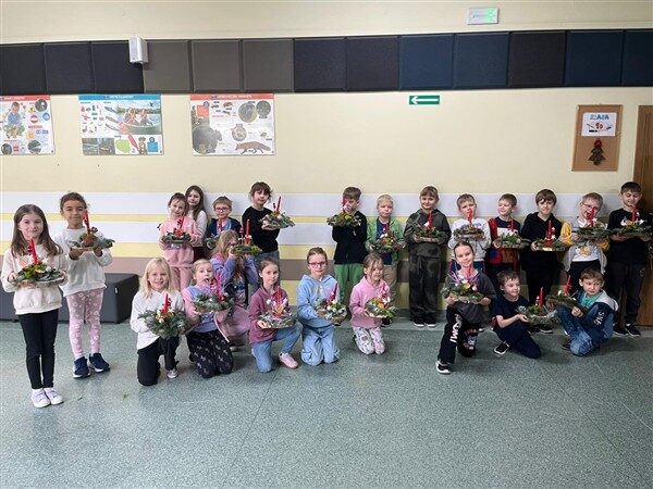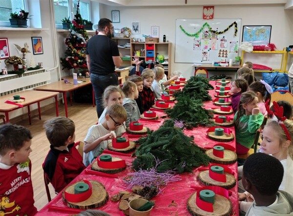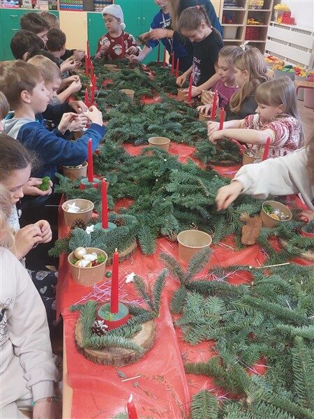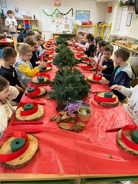Tuż przed świętami, 17 grudnia, klasy 1a, 1c, 1d, 2c i 3c, wzięły udział w tematycznych warsztatach. Otoczone pięknym zapachem jodły, który roznosił się po całej szkole, dzieci stworzyły swoje własne stroiki bożonarodzeniowe. W ruch poszły gałązki, bombki, gwiazdki, szyszki, wesołe Mikołaje i inne świąteczne ozdoby. Przede wszystkim jednak w ruch poszła wyobraźnia i jak się okazało, niezwykły talent florystyczny. Dzieci z wielkim zapałem, uśmiechem i radością oddały się pracy twórczej, a dzieła, które powstały z pewnością będą najważniejszą, świąteczną ozdobą w ich domach.