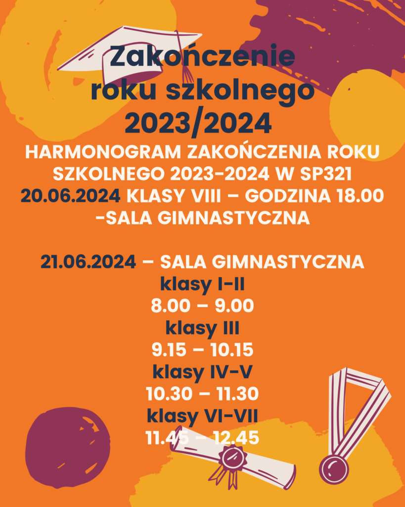 Uroczyste zakończenie roku szkolnego dla uczniów klas 1-8 odbędzie się wg podanego harmonogramu.