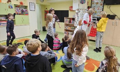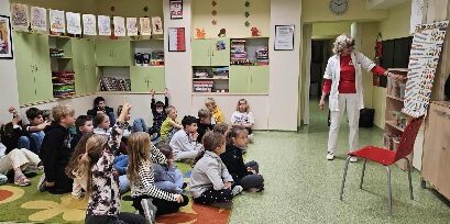 Gościliśmy pielęgniarkę szkolną, która przeprowadzila pogadankę na temat wpływu owoców i warzyw na nasze zdrowie.