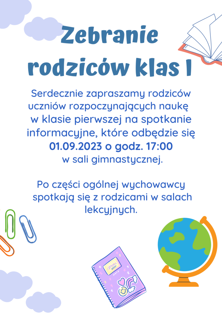 Serdecznie zapraszamy rodziców uczniów rozpoczynających naukę w klasie pierwszej na spotkanie informacyjne, które odbędzie się 01.09.2023 o godz. 17:00 w sali gimnastycznej. Po części ogólnej wychowawcy spotkają się z rodzicami w salach lekcyjnych.